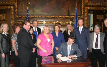 | Governor Pawlenty signs S.F. 2941, also known as "Justin's Law," which will stop abuse of illicit online pharmacy sites and make it more difficult to buy addictive prescription drugs without a prescription over the internet in Minnesota. The Governor is joined by Dan Pearson (Justin's father), Whitney Pearson (Justin's sister) and Sean Pearson (Justin's Brother) and Greta Abel (a friend of the Pearson family). Also participating are bill authors Rep. Steve Gottwalt (R-St.Cloud), Sen. John Marty (DFL-Roseville) and co-author, Sen. Tarryl Clark (DFL-St. Cloud) -- May 15, 2008 |